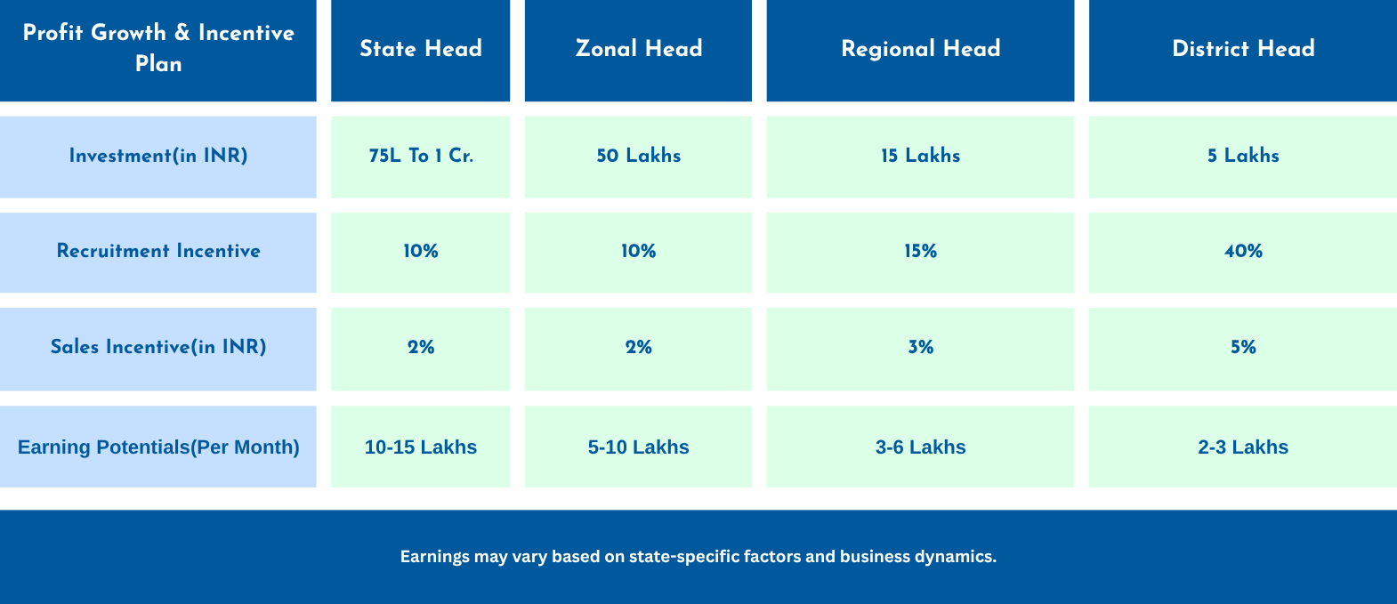 If a Zonal Head Recruit 200 franchises & if the Purchase is 5 lakhs Per Month then the ZH can earn 20 Lakhs Per Month Sales Incentives/Lifetime Monthly Royalty.